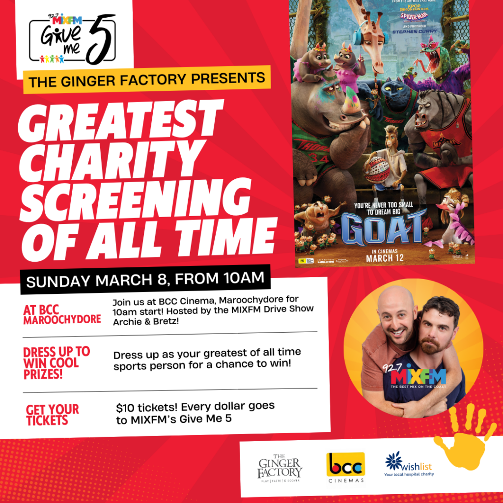 How would you like to be at the greatest family day out of all time? Join Archie & Bretz at BCC Maroochydore for a screening of animated feature GOAT. Dress up as your ‘greatest of all time’ sports hero and win prizes! With every dollar raised going to Give Me 5!