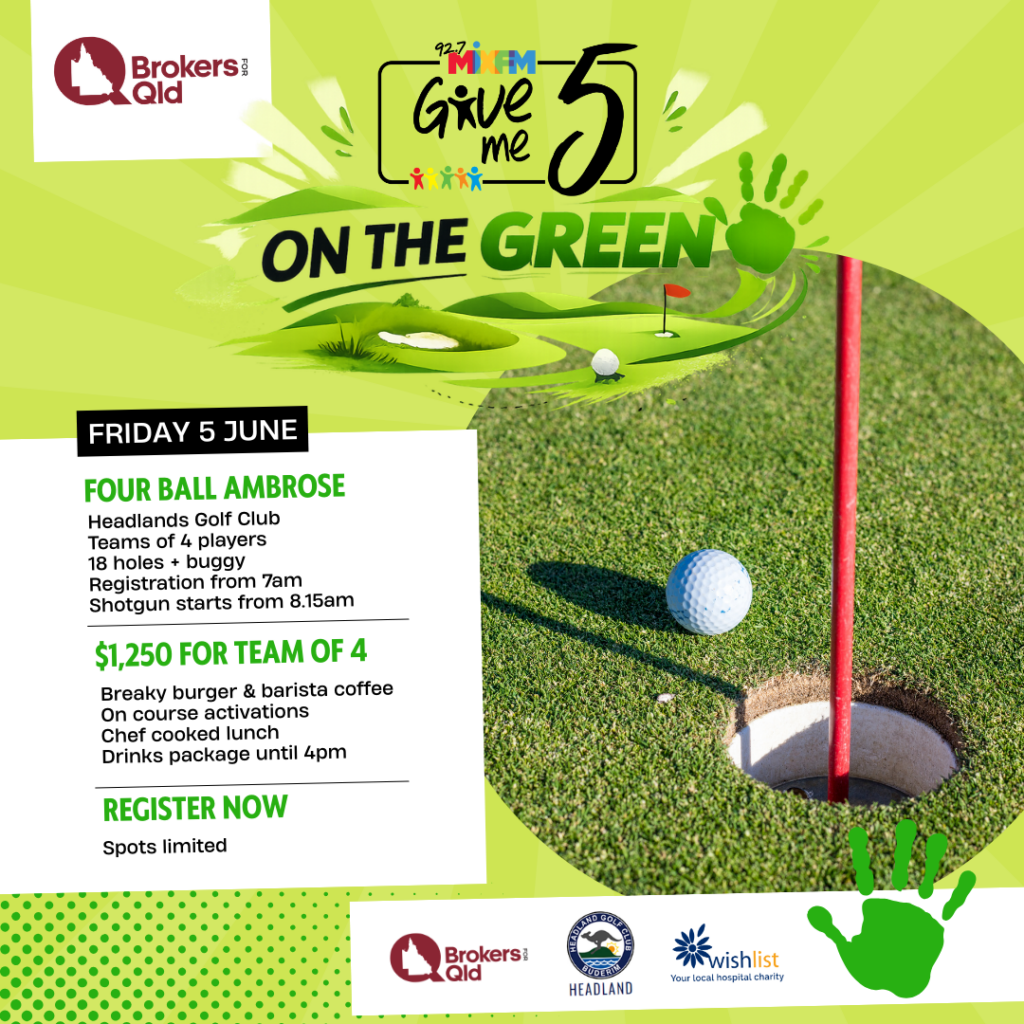 Ready to swap your office chair for a golf buggy? The Give Me 5 on the Green – Brokers for QLD Golf Day is calling your name! For just $1,250, your team of four gets breakfast from 7, buggies, drinks, on-course activations, lunch at Headlands Golf Club and more – with all proceeds helping sick kids and their families!