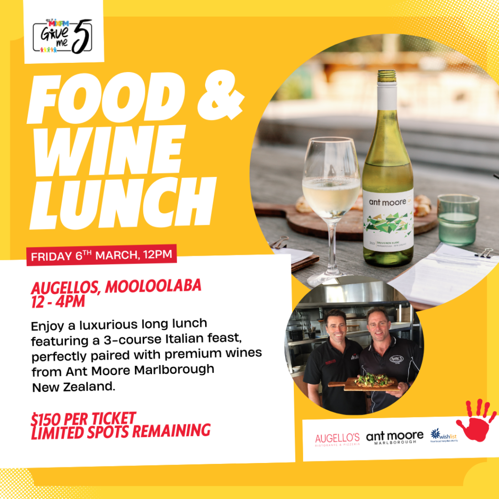 Join us at Augello’s Mooloolaba for a luxurious long lunch featuring a 3-course Italian feast, perfectly paired with premium wines from Ant Moore Marlborough New Zealand. All while soaking in those signature coastal views off Mooloolaba and raising funds for MIX FM’S Give Me 5 appeal.
